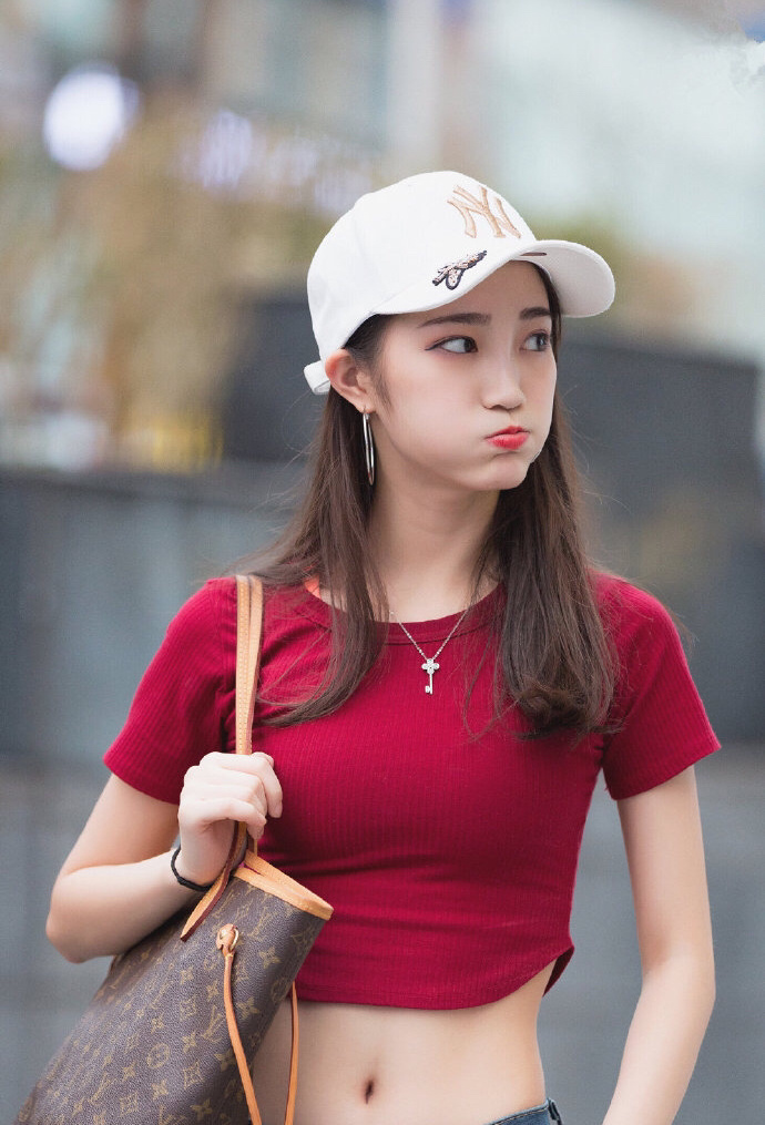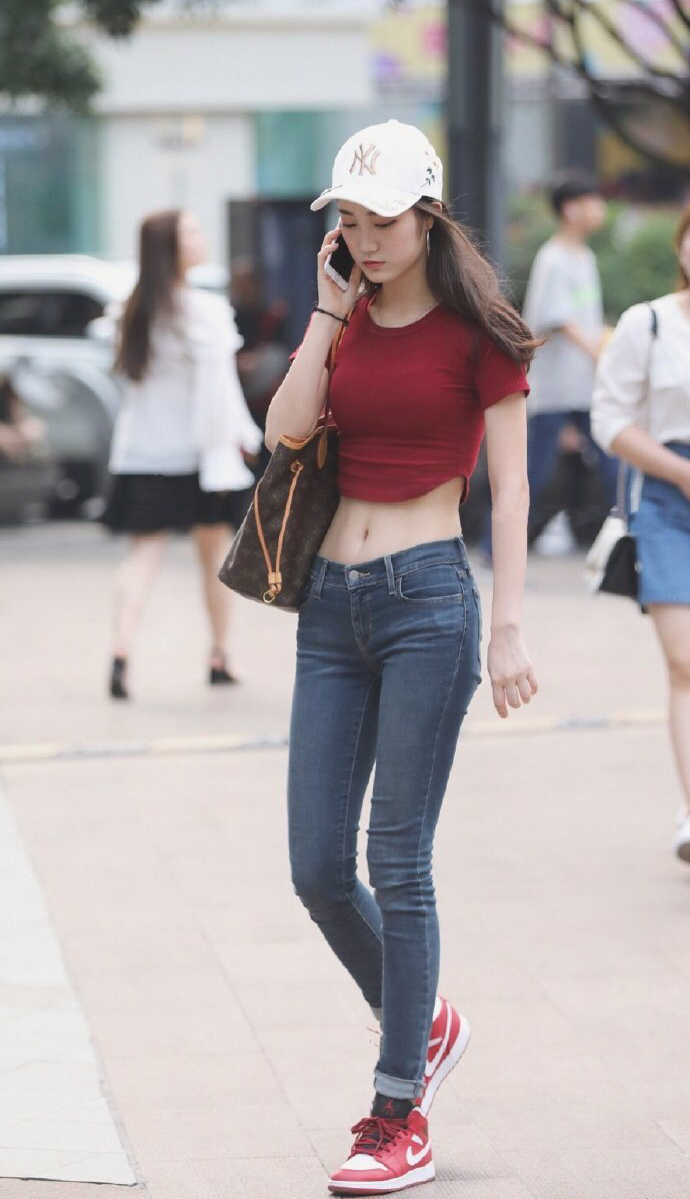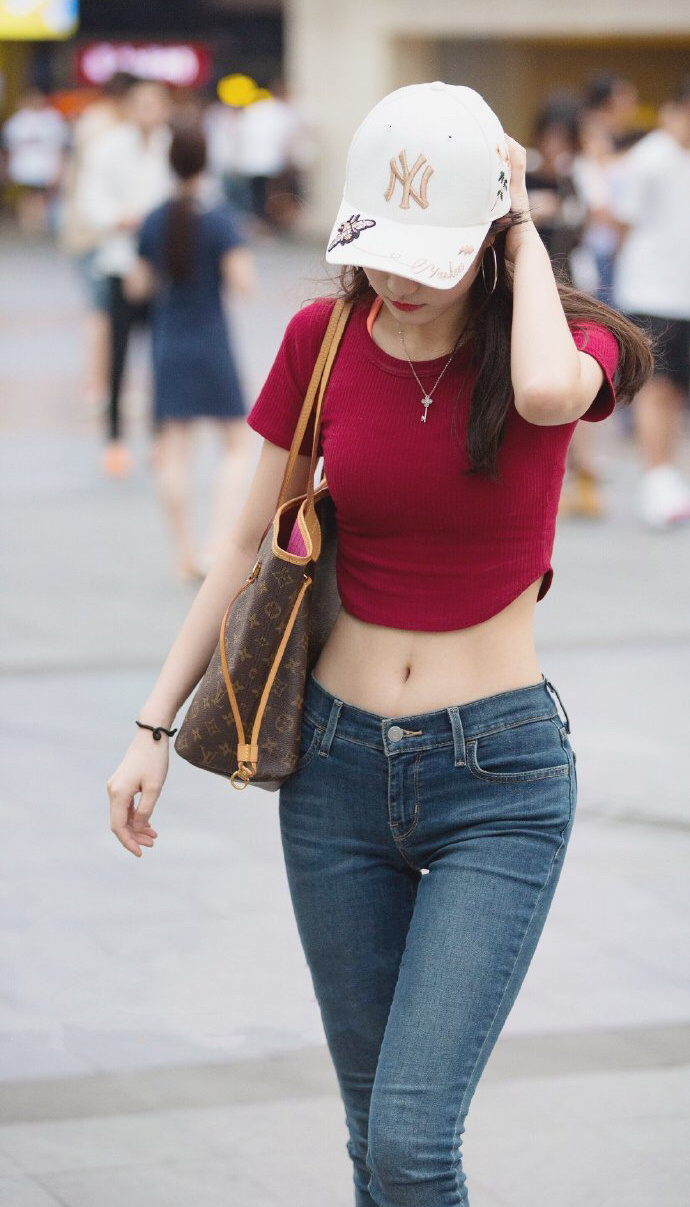 肚脐装露小蛮腰的紧身牛仔裤街拍美女图片