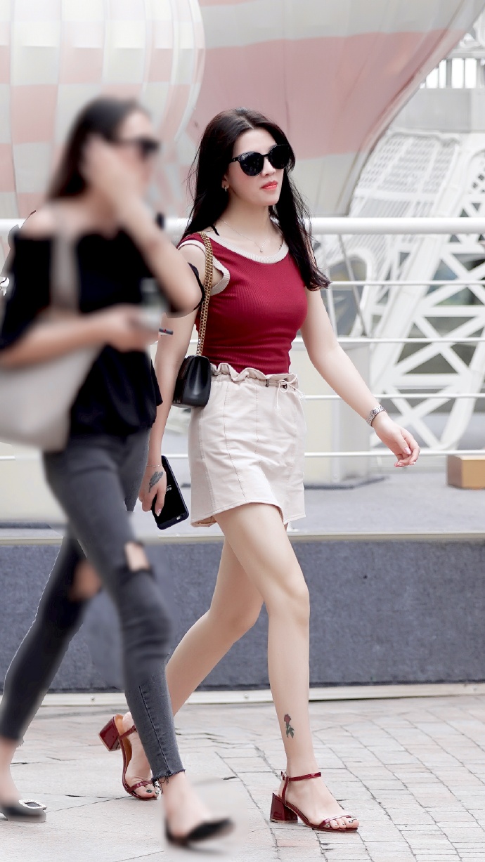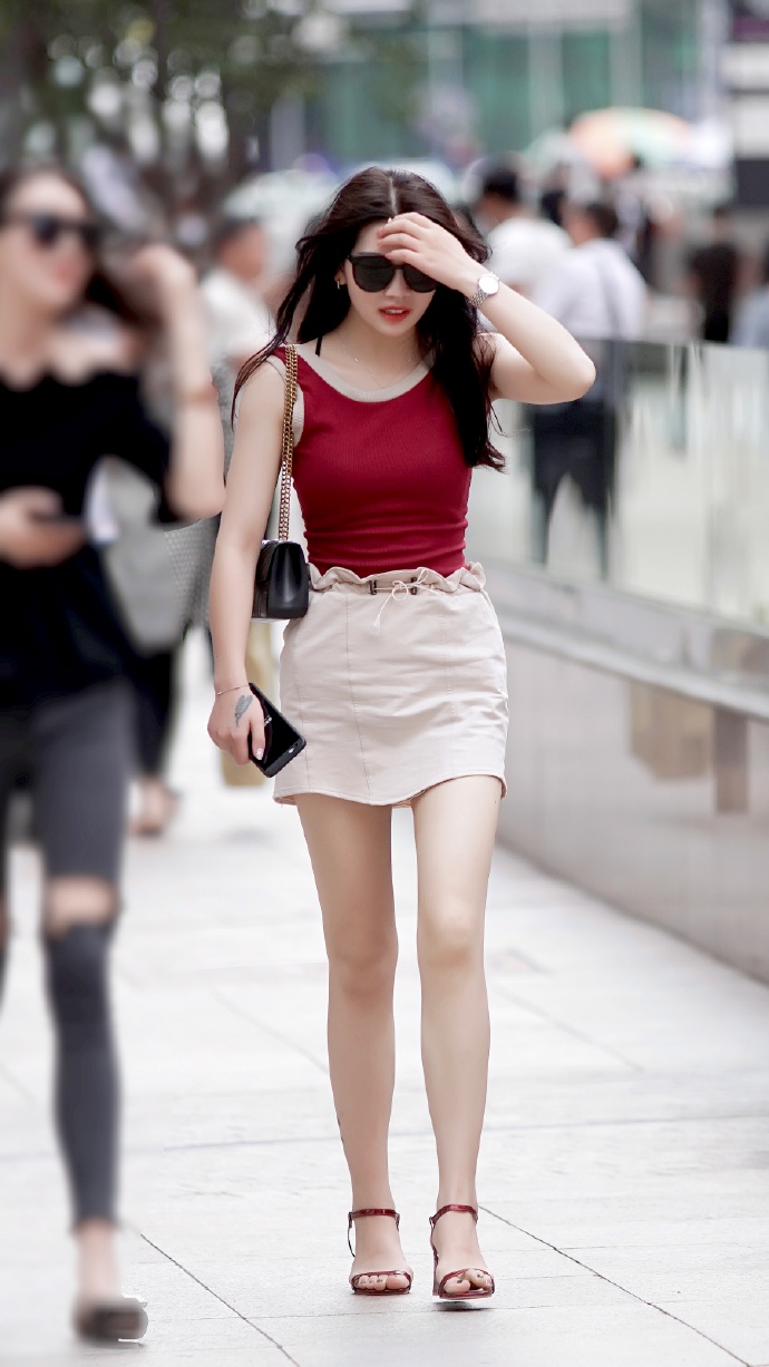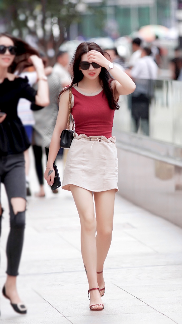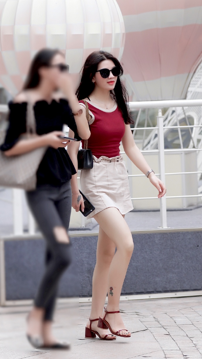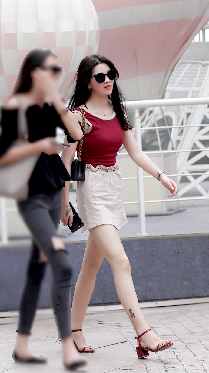 红白穿搭的肤白貌美街拍美女图片
