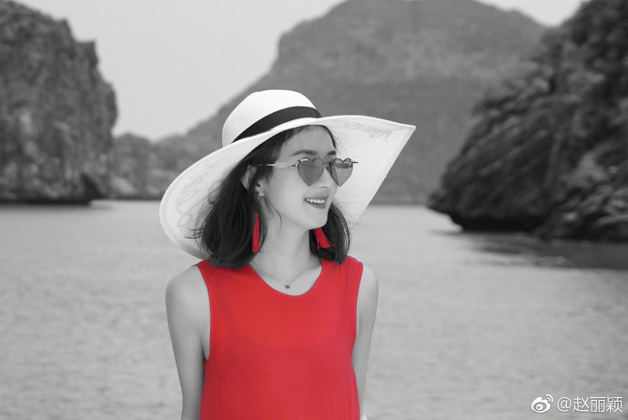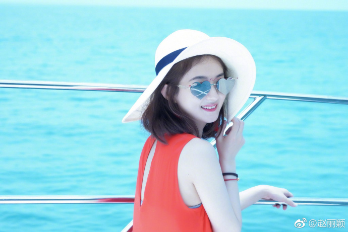 大眼美女明星赵丽颖红裙度假图片阳光沙滩大海