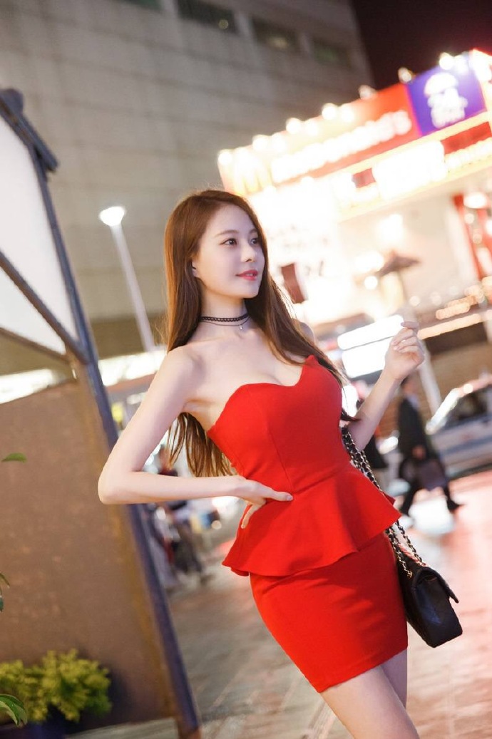 网红美女红色抹胸裙套装露乳沟照