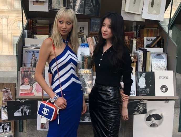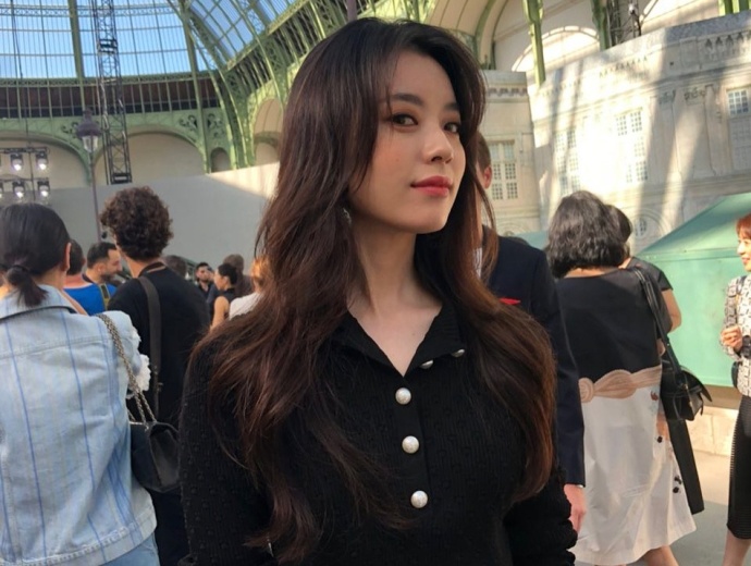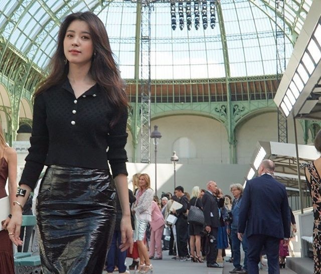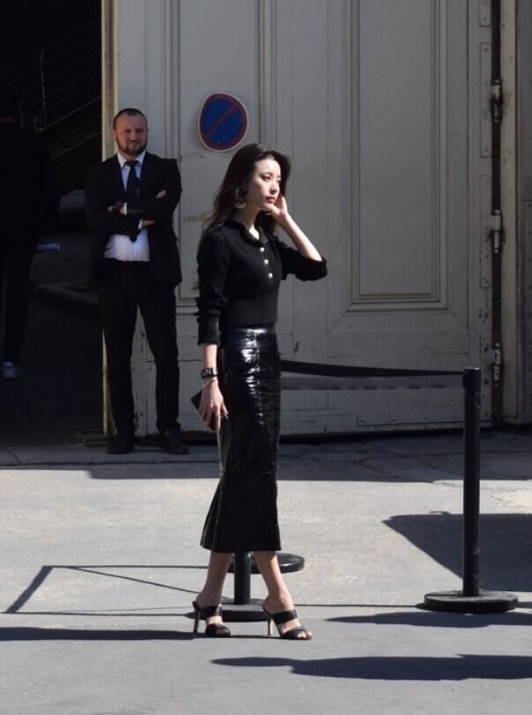 韩国美女韩孝周出席巴黎时装周身穿黑皮裙展现