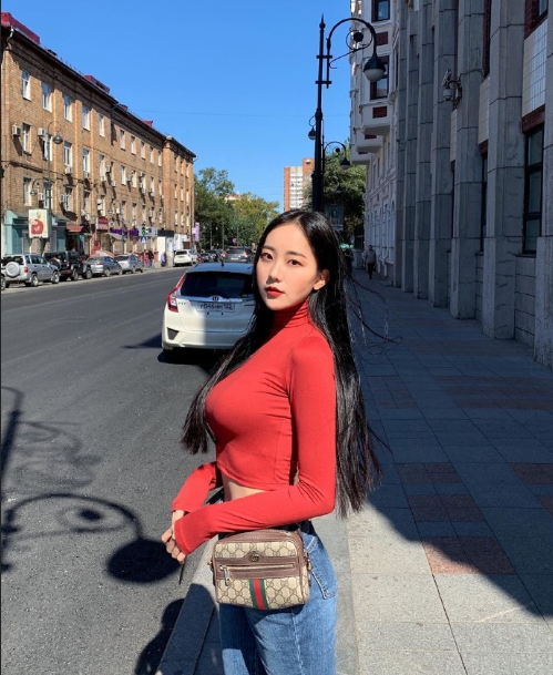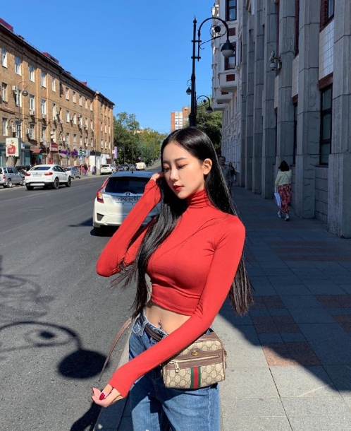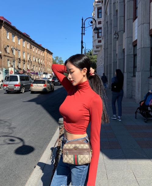 韩国红衣美女露小蛮腰性感图片