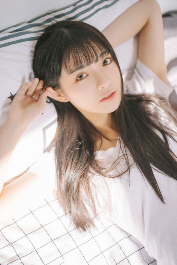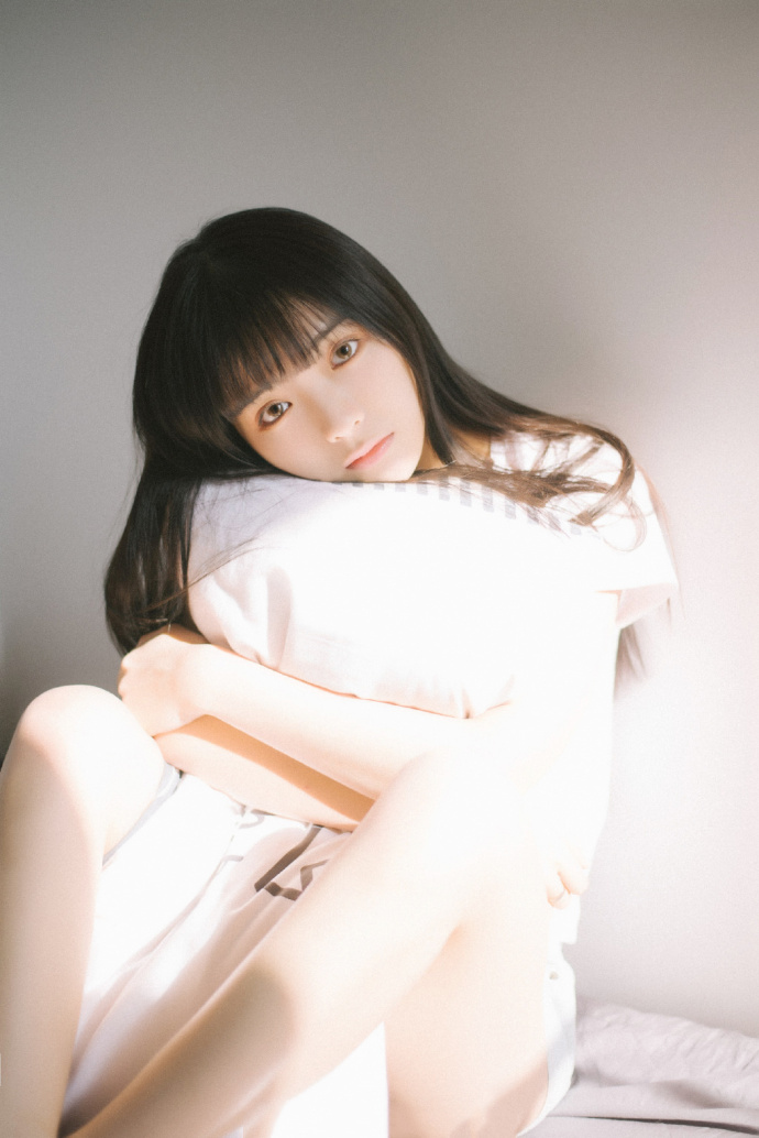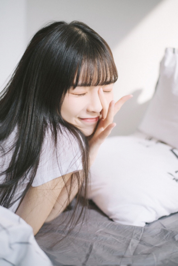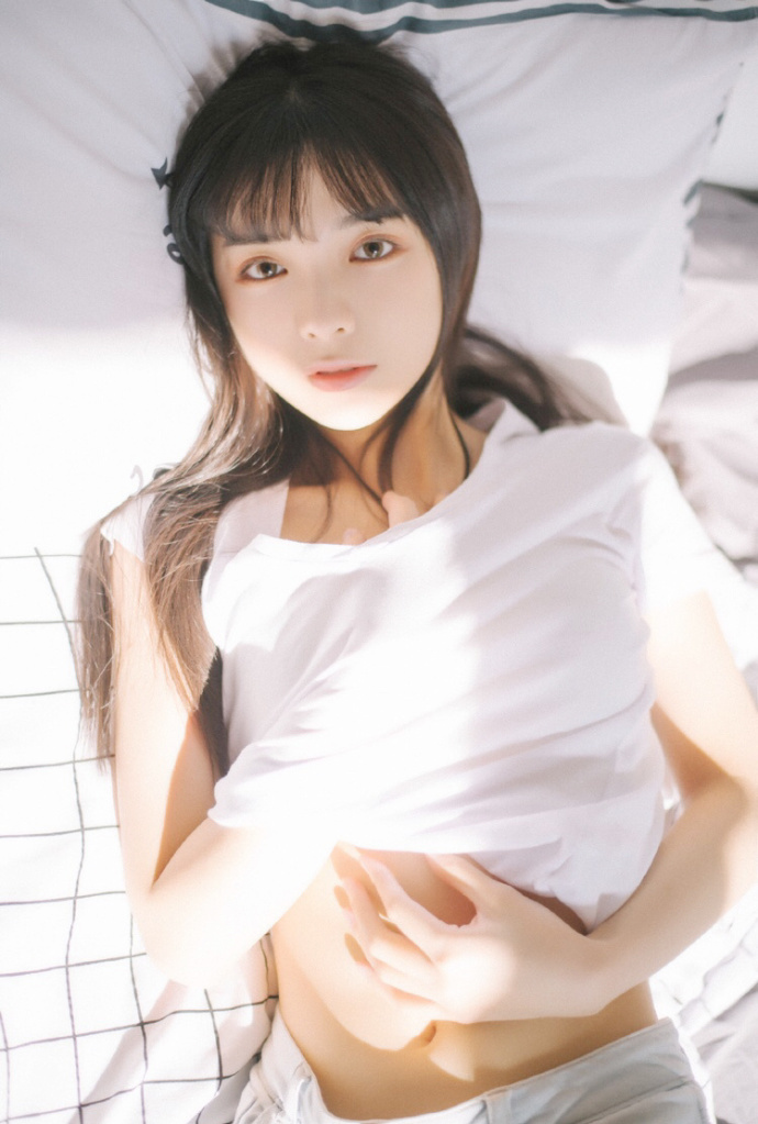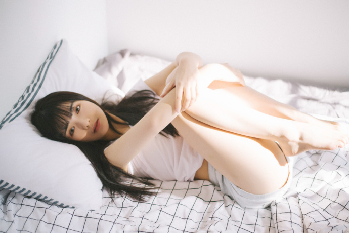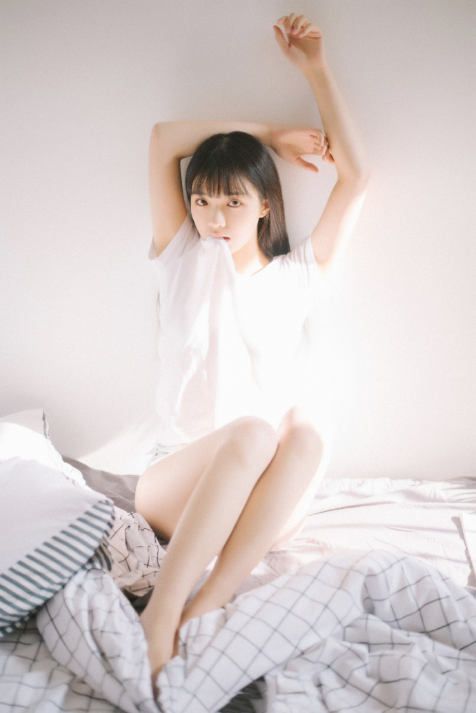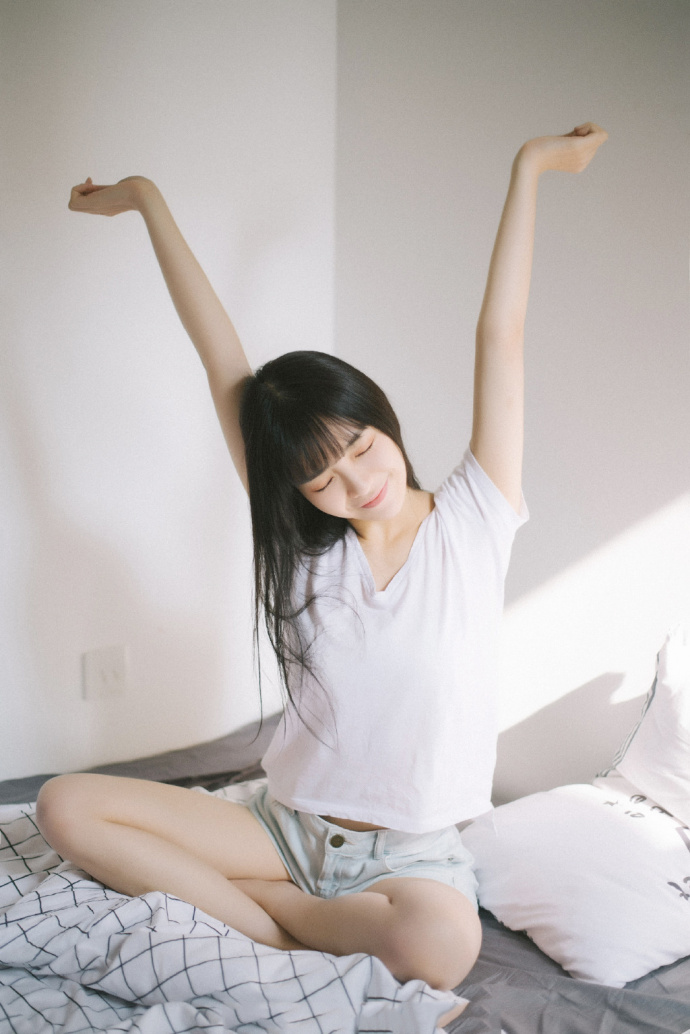 长发美女尤物T恤短裤大长腿床上性感写真